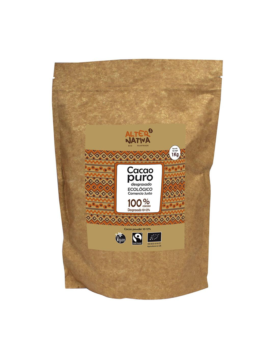 Cacao de AGRICULTURA ECOLÓGICA, cultivado y elaborado sin abonos ni pesticidas químicos. Adecuado para vegetarianos y veganos. No contiene colorantes ni conservantes. Solo cacao, sin aditivos añadidos. Sin lactosa y sin gluten. De la pepa del cacao se extrae manteca hasta dejar solo un 10/12% en el polvo. Este cacao es más bajo en grasas y algo más fuerte de sabor y textura.