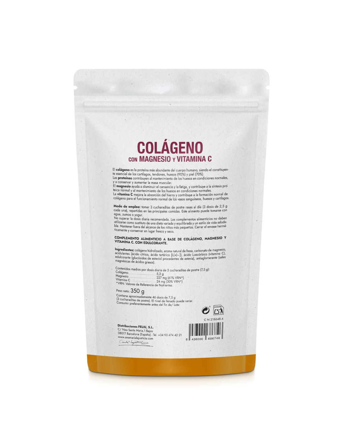 Ingredientes: Colágeno hidrolizado, aroma natural de fresa, carbonato de magnesio, acidulantes (ácido cítrico, ácido tar- tárico [L(+)–]), ácido L-ascórbico (vitamina C), edulcorante (glucósidos de esteviol), antiaglomerante (sales magnésicas de ácidos grasos).