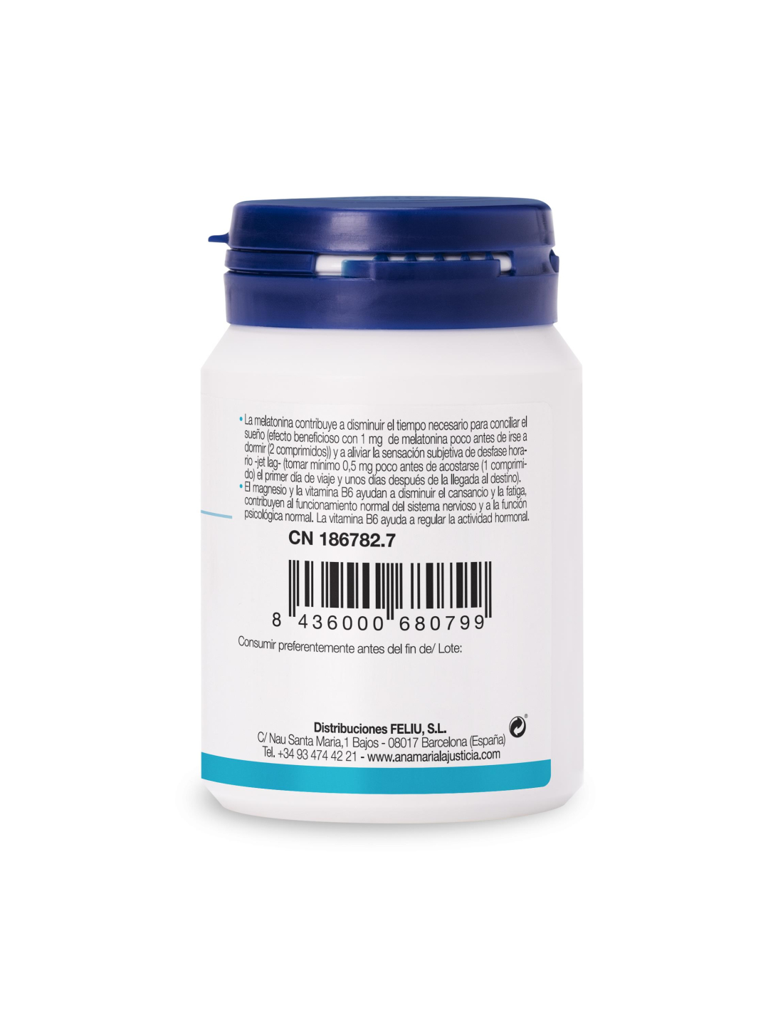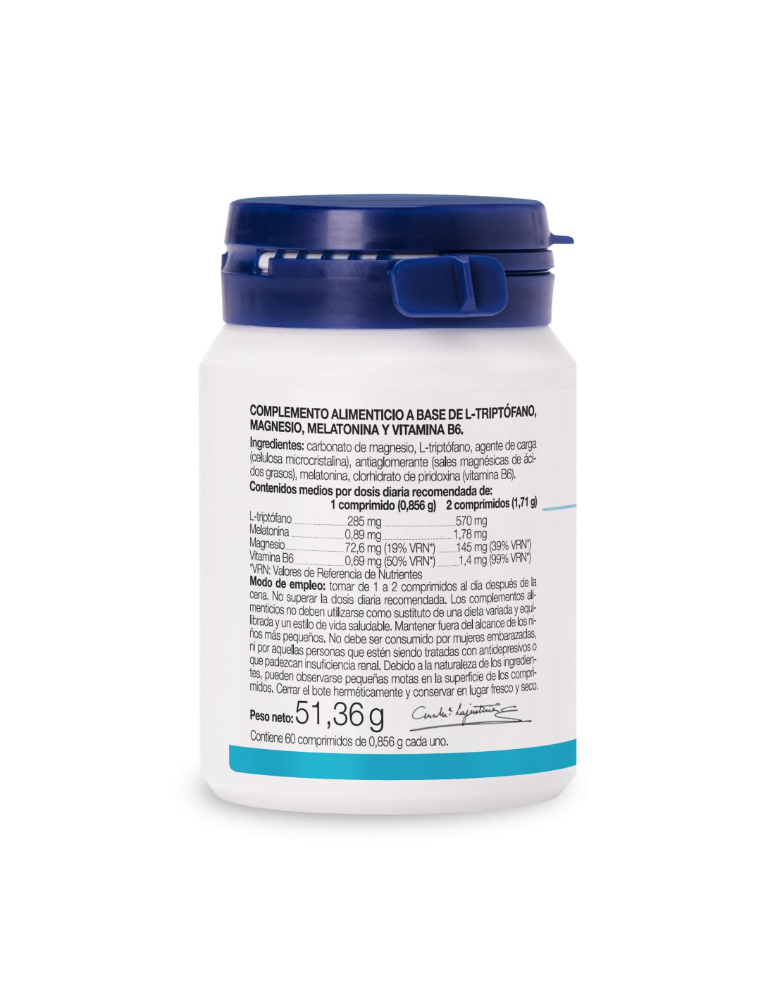 Ingredientes: Carbonato de magnesio, L-triptófano, agente de carga (celulosa microcristalina), antiaglomerante (sales magnésicas de ácidos grasos), melatonina, clorhidrato de piridoxina (vitamina B6).