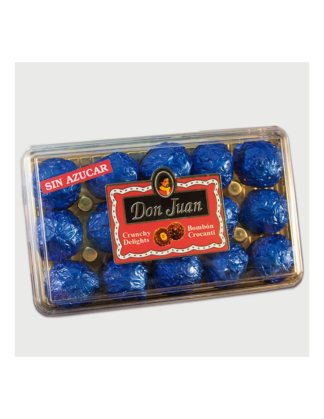 Oblea esférica rellena de crema sabor a avellana y avellana entera en el centro. Esta oblea está cubierta de cobertura vegetal de cacao sin azúcar.